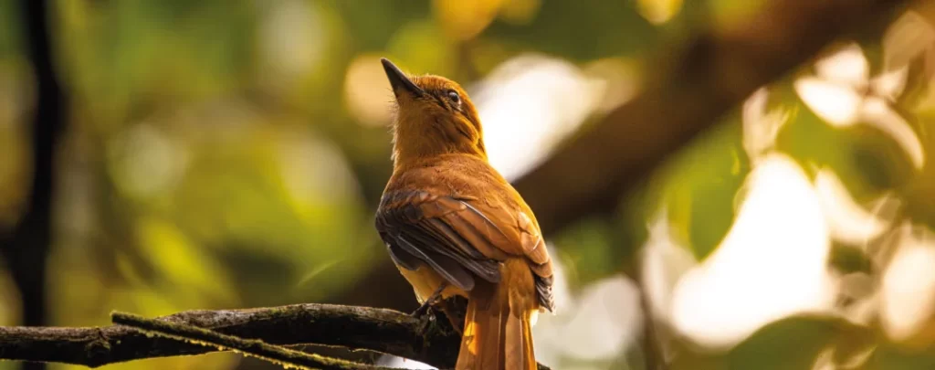 Los senderos del bosque ofrecen acceso a otra dimensión de la avifauna: trepadores, hormigueros, tinamúes, y especies memorables como el Screaming Piha (famoso por su canto) o el colorido cotinga rojo de cuello negro.